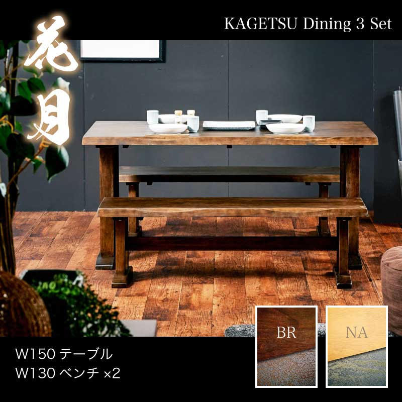 ポイント5倍SALE 25日迄◆ 150cm ダイニング3点セット 4人掛け テーブルセット ダイニングセット テーブル ベンチ セット 長椅子 2脚 セット 食卓 和風 木製 ナチュラルダイニング ブラウン 花月 和風家具 料亭家具 高級感 無垢材 重厚感 茶色 薄茶色 和家具