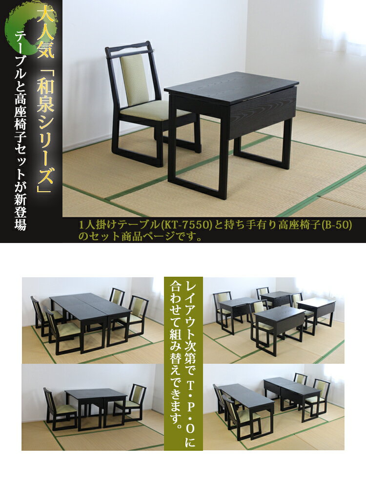 ■商品名 【1人掛けテーブル+座面高35cm持ち手有りチェア】 ↓↓↓セット内容↓↓↓ ・お座敷テーブル「和泉」1人掛け用 KT-7550×1卓 ・高座椅子「和泉」座面高35cm 持ち手有り B-50×1脚 ■商品説明 幅75cm、奥行50cmのコンパクトなお座敷用テーブルと高座椅子のセット。