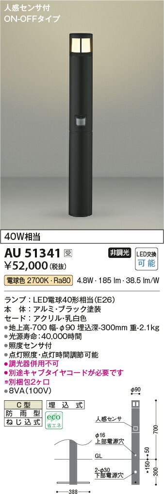 AU51341エクステリア LEDガーデンライト ローポール L700mm ガードタイプ 人感センサ付 ON-OFFタイプ白熱球40W相当 電球色 非調光 防雨型 埋込式コイズミ照明 照明器具 庭 入口 エントランス 玄関 植込 屋外用 ポール灯