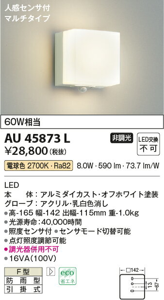 AU45873L コイズミ照明 人感センサ付 アウトドアポーチライト [LED電球色][オフホワイト] 屋外用ライトメーカー希望小売価格はメーカーカタログに基づいて掲載しています。