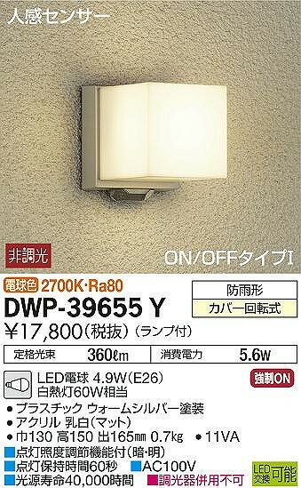 本体サイズ: 巾130 高150 出165mm主な仕様: DAIKO センサー付 防雨型■点灯照度調節機能付(15・45lx)■点灯保持時間60秒■AC100V■光源寿命40000時間■調光器併用不可11VA定格光束 360lm消費電力 5.6WRa80白熱灯60W相当ON/OFFタイプI人感センサー素材/色/仕上:プラスチック ウォームシルバー塗装 アクリル 乳白(マット)(ランプ付)■DWP-39655Yの取付方法■検索コード 20150612■ジャンル インテリア・寝具・収納 ライト・照明器具 壁掛け照明・ブラケットライト■カテゴリ 照明器具 エクステリアライト ポーチライト