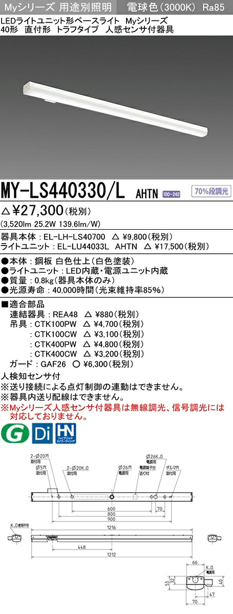 三菱電機 施設照明LEDライトユニット形ベースライト Myシリーズ40形 直付形 トラフタイプ 人感センサ付FLR40形×2灯相当 一般タイプ 段調光 電球色MY-LS440330/L AHTN